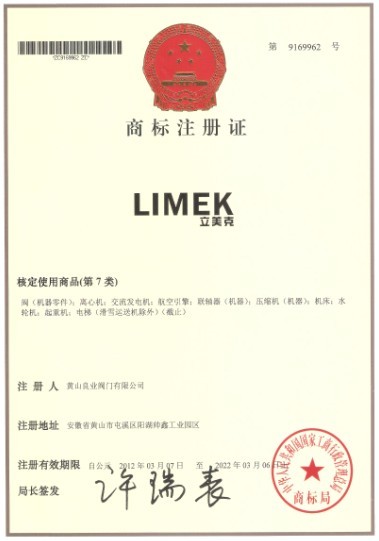 近日,國(guó)家商標(biāo)局向黃山良業(yè)閥門(mén)有限公司頒發(fā)了“l(fā)imek”立美克商標(biāo)注冊(cè)證 。