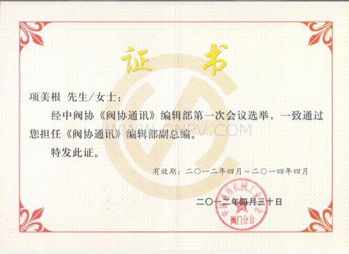 黃山良業(yè)閥門項(xiàng)美根董事長(zhǎng)聘任為《閥協(xié)通訊》編輯部副總編